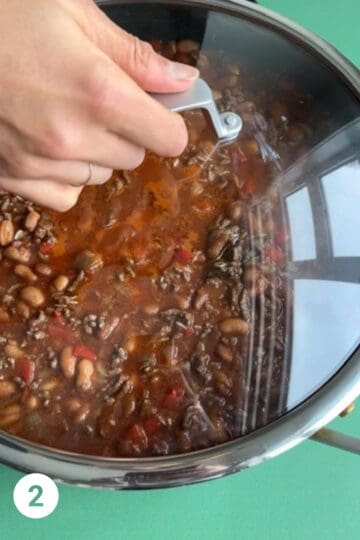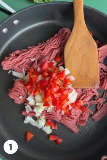 - Cook ground beef, sweet pepper, onion and garlic over medium heat in a large skillet, stirring often and using the back of a spoon to break up meat into small chunks, for 5 to 7 minutes or until beef is browned. Drain, if necessary.
